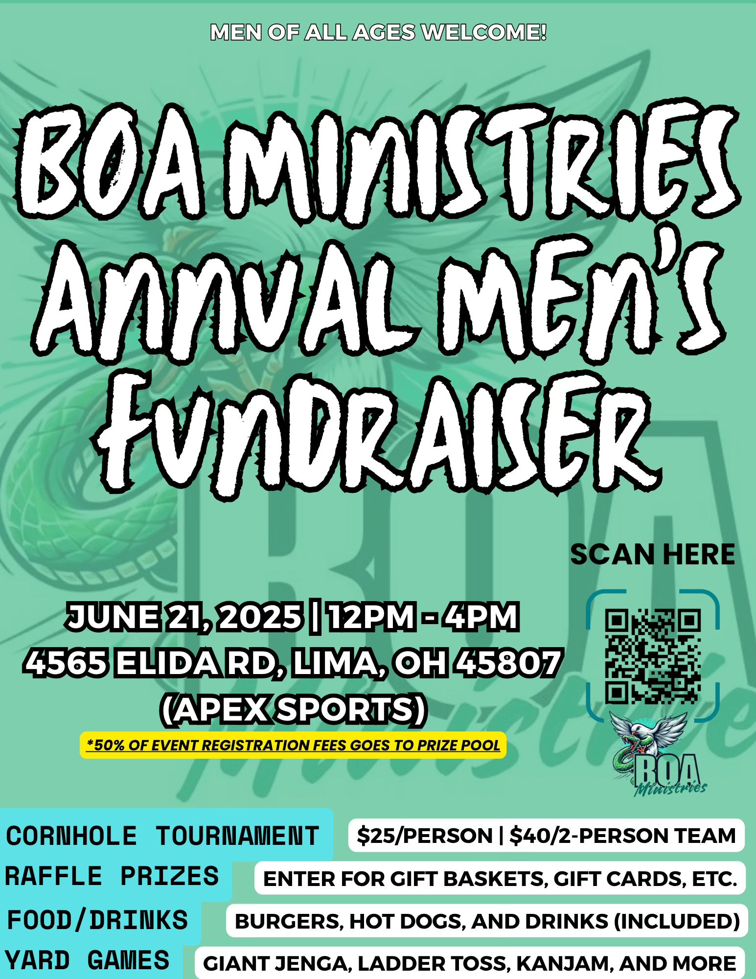 Join BOA Ministries on Saturday, June 21, 2025, from 12β4 PM at The Apex Center in Lima, OH for their Annual Menβs