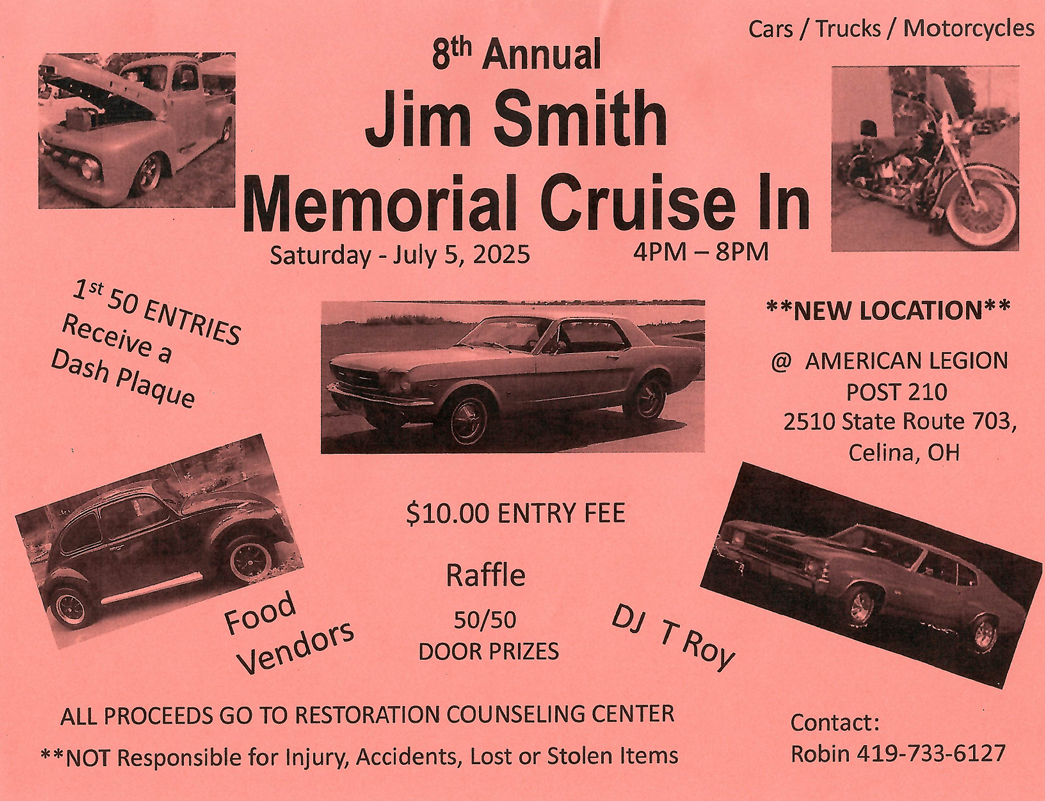 All proceeds benefit Restoration Counseling Center Cars, Trucks, Motorcycles $10 Entry Fee Dash Plaque for the first 50 entries Door Prizes, 50/50,